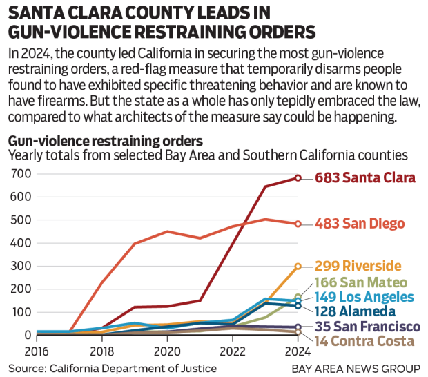 Santa Clara County has secured the most gun-violence restraining orders in the state for two years running. It filed 683 orders in 2024, or 41% more than San Diego County, which filed 483 and had previously topped the list.